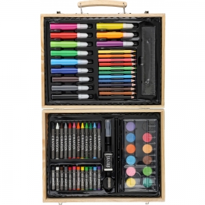 Artikel-Nr: GIV1207022011Malkoffer aus Sperrholz mit Holzkasten und Holzgriff, enthält 66 Teile: 12 Wachsmalstifte, 12 Buntstifte (gespitzt), 12 Filzstifte, 12 Ölkreiden, Klebestift, Radiergummi, Anspitzer, Lineal, Pinsel, 12 Farben und eine Palette. Einzeln verpackt in brauner Pappschachtel mit Tragegriff.
