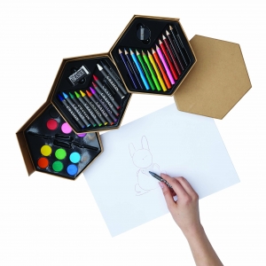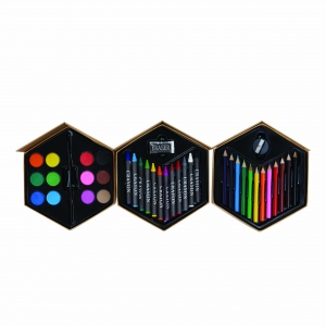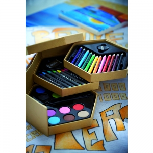 Artikel-Nr: INP56-0504105Malset COLOURFUL LEVEL zum Ausprobieren verschiedener Maltechniken in vielen Farben: bestehend aus 12 Wassermalfarben inkl. Pinsel, 12 Wachsmalstiften und einem Radiergummi, 12 Buntstiften (angespitzt) inkl. Anspitzer, Pappkarton in 3 Etagen ausklappbar