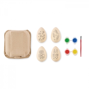 Artikel-Nr: OCBMO2563-40Malset bestehend aus 4 Ostereiern aus Holz und 4 Farben auf Wasserbasis und 1 Pinsel. Lieferung im Eierkarton.