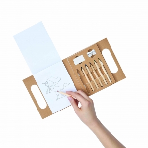 Artikel-Nr: INP56-0504116Malset PAINTING BAG: bestehend aus 30 Malblättern mit verschiedenen Motiven zum Ausmalen, 6 kleine verschiedenfarbige Naturholz-Buntstifte, angespitzt, Radiergummi und Anspitzer, in Papptasche mit Tragegriff