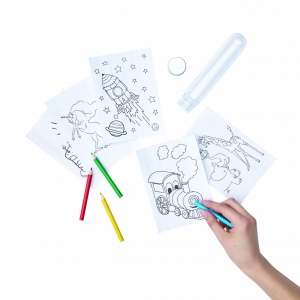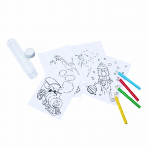 Artikel-Nr: INP56-0504115Malset TUBY, in Dose: bestehend aus 4 Buntstiften (angespitzt), 5 Malblättern mit verschiedenen Motiven zum Ausmalen
