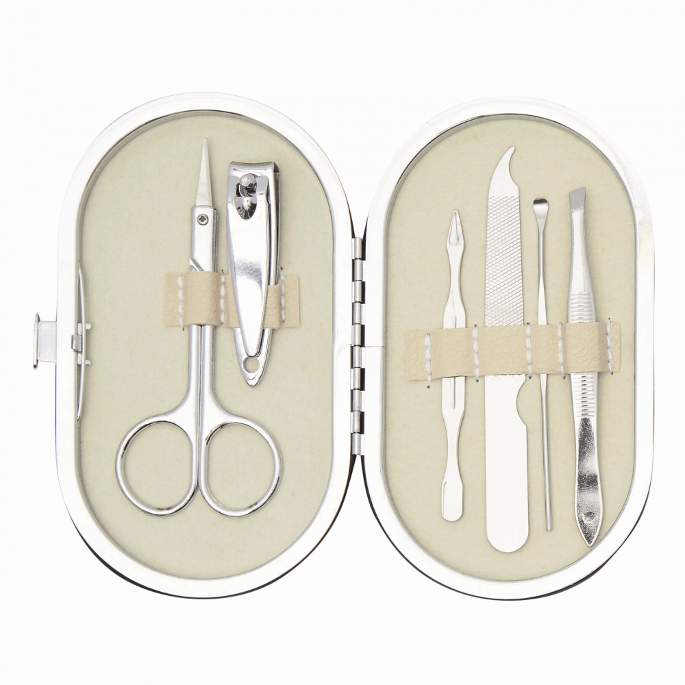 Artikel-Nr: INP56-0499096Maniküreset DENISE, 6-teilig: bestehend aus Nagelschere, Nagelfeile, Pinzette, Nagelknipser, Nagelstab und Nagelschaber, im ovalen Etui mit Seitknopfverschluss