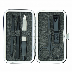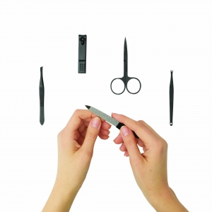 Artikel-Nr: INP56-0499052Maniküreset PRETTY IN BLACK, 5-teilig: bestehend aus Nagelfeile, Pinzette, Nagelhautschneider, Nagelknipser und Nagelschere, im rechteckigen Etui mit Seitknopfverschluss