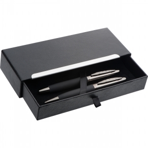 Artikel-Nr: MCM1339203Mark Twain Schreibset aus Metall im schwarzen, aufschiebbaren Etui mit blau schreibendem Drehkugelschreiber (Großraummine) und Füllfederhalter mit gummiertem Schaft. Ihre Werbung lasern wir neben dem Clip - der Gravurpreis versteht sich für beide Schreibgeräte.