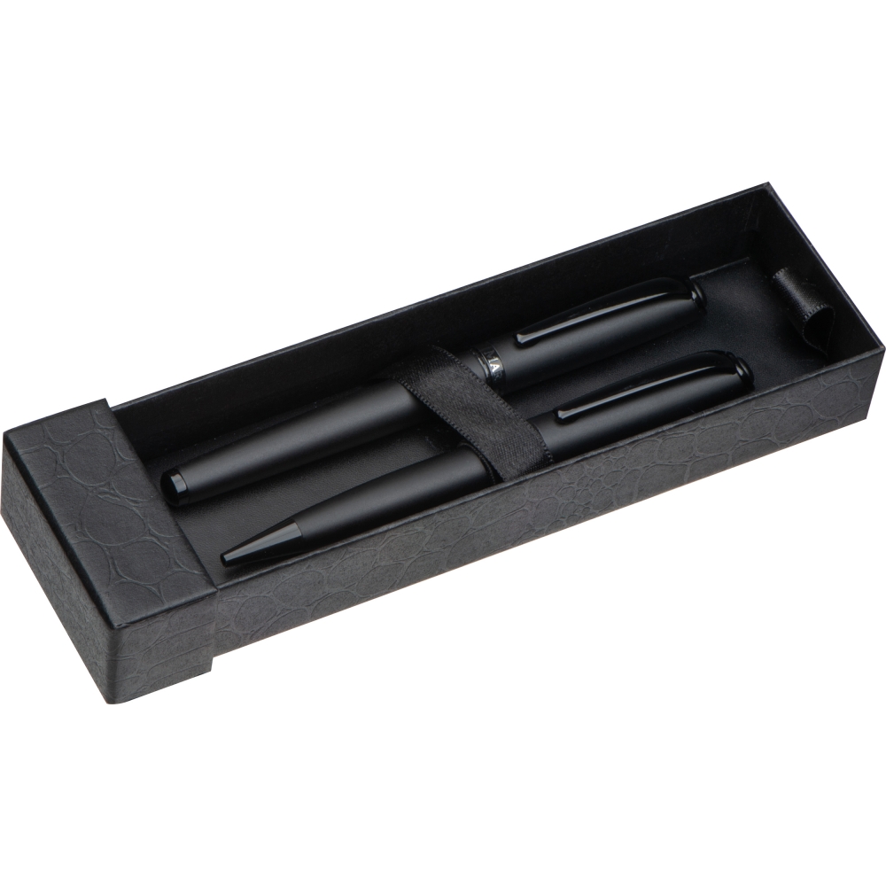Artikel-Nr: MCM1385603Mark Twain Schreibset bestehend aus einem Drehkugelschreiber und einem Rollerball aus Metall mit schwarzem, mattem Schaft und schwarz glänzenden Applikationen, verpackt in einer Geschenkbox. Ihre Werbung wird auf beide Schreiberäte graviert.