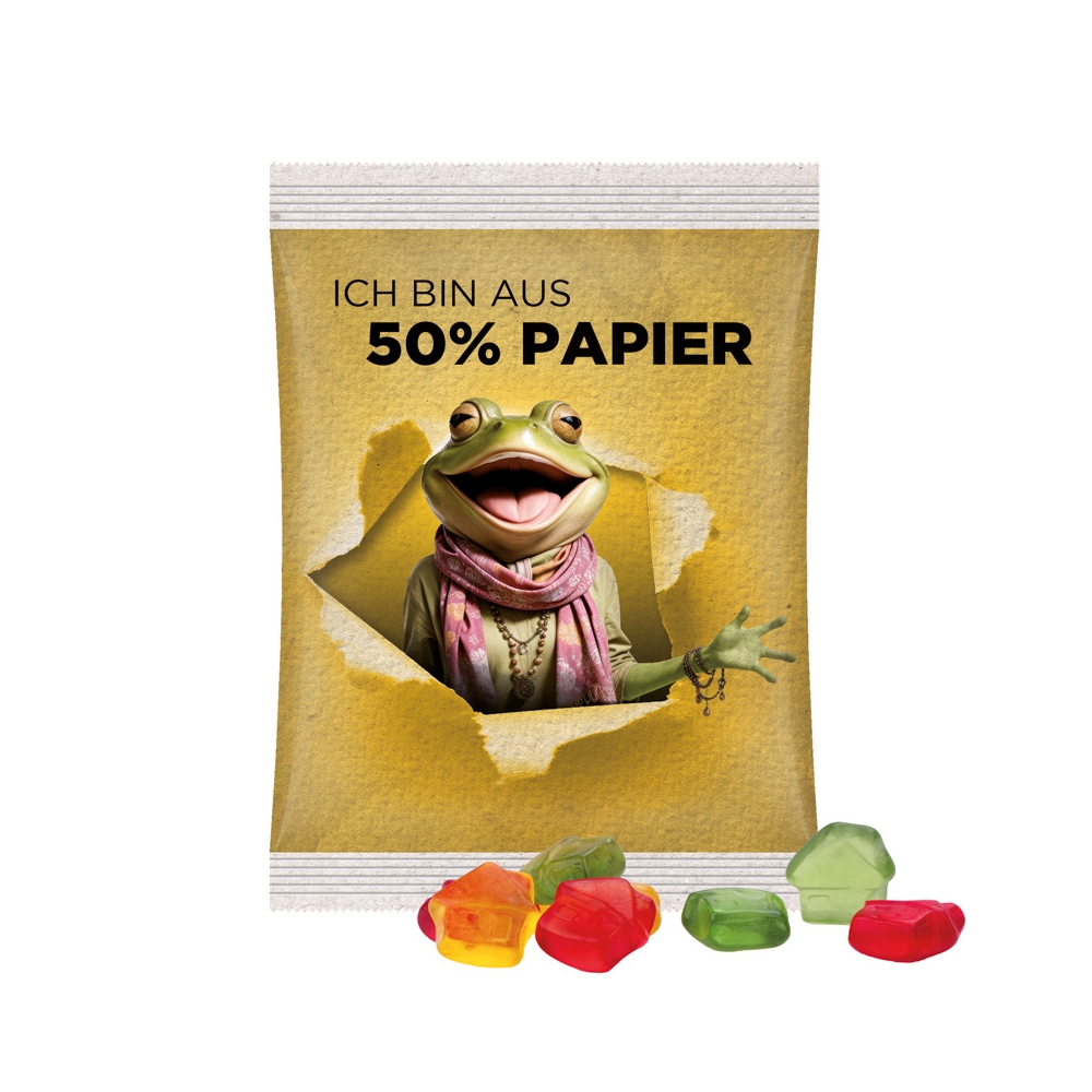 Artikel-Nr: PUC1024.00063Trolli Fruchtgummi in Tüte aus weißer Folie mit ca. 50% Papieranteil, individuell bedruckt. Inhalt: Trolli Fruchtgummi Haus, in Premium Qualität mit 10 % Fruchtsaftanteil, bunt gemischt, 50 g