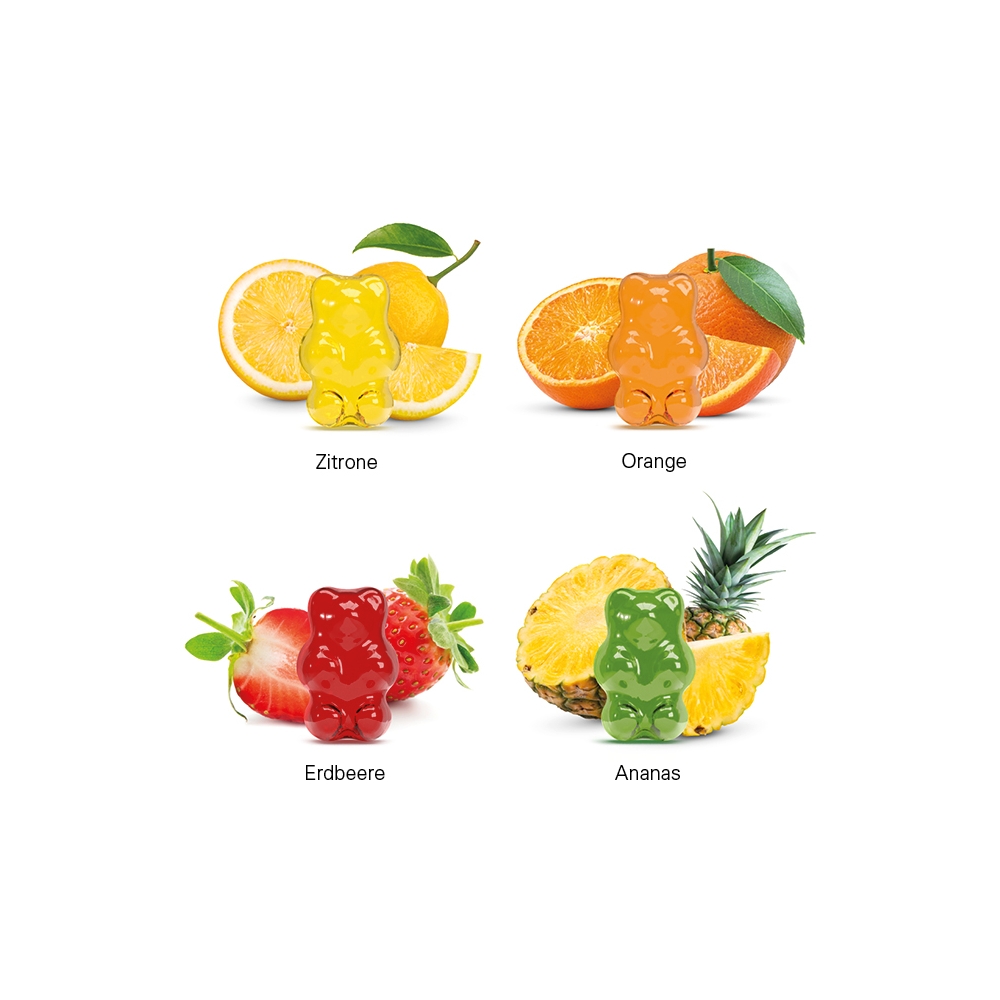 Geschmacksrichtungen / Sorten: Zitrone, Orange, Erdbeere, Ananas - gemischt oder Erdbeere oder Ananas