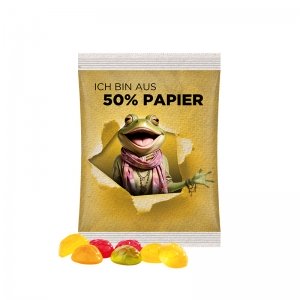 Artikel-Nr: PUC1024.00068Trolli Fruchtgummiin Tüte aus weißer Folie mit ca. 50% Papieranteil, individuell bedruckt. Inhalt: Trolli Fruchtgummi Fußbälle, in Premium Qualität mit 10 % Fruchtsaftanteil, bunt gemischt, 50 g