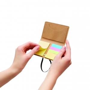 Artikel-Nr: INP56-1103139Memo box STICK ME: 1 Klebezettelnotizblock und 5 verschiedenfarbige Klebezettelblöcke, innen Visitenkarten-Einsteckfach, außen Gummiband zum Fixieren – aus recycelbaren Materialien