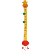 Die Giraffe hat einen Holzkopf mit Stoffohren und einen Stoffkörper mit Maßband. Zwei Holz-Blätter mit Klettband markieren die Größe des Kindes. Mit Haken. Stoffteil waschbar.