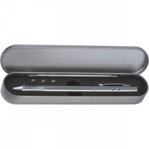 Artikel-Nr: EAG279807Laserpointer aus Metall mit Kugelschreiber (rot- und blauschreibende Mine) und LED-Lampe. Im Lieferumfang sind drei Knopfzellen und die Metallbox bereits enthalten. Ihre Werbung lasern wir auf den Schaft.