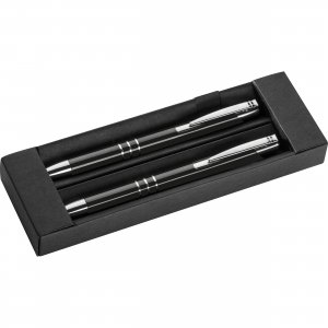 Artikel-Nr: EAG333003TOP PRICE! Metall-Schreibset, bestehend aus einem Kugelschreiber mit blauschreibender Großraummine und einem Druckbleistift, verpackt im Pappetui. Ihre Werbung lasern wir rechts vom Clip am Schaft auf beiden Schreibgeräten.