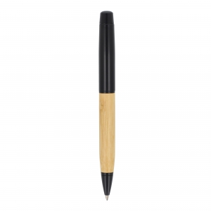 Artikel-Nr: ART82173N0002Metallkugelschreiber mit schwarzen Metallverzierungen und einem Schaft aus Bambus, elegant präsentiert in einer Bambusröhre. Der Kugelschreiber hat eine blaue Mine.