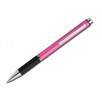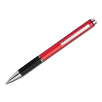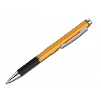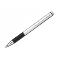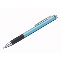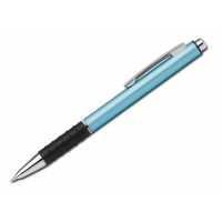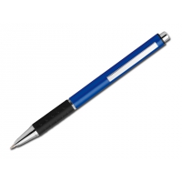 Metallkugelschreiber mit Gummigrip und blauschreibender Mine.