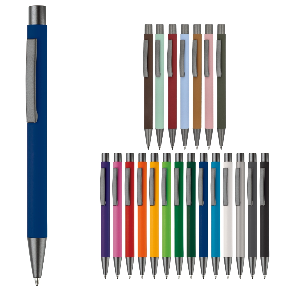 Artikel-Nr: ART87767N0079Aluminium Kugelschreiber mit eleganter Soft-Touch-Oberfläche. Hat einen stabilen Metallclip und ist in tollen Farben lieferbar. Blauschreibende Mine.