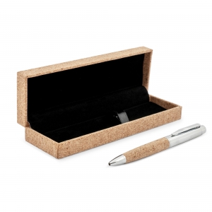 Artikel-Nr: ART82142N0094Kugelschreiber in Eco-Optik aus Metall mit Korkschaft. Der Stift hat einen Drehmechanismus und eine Metallmine. Lieferung in einer edlen Geschenkbox.