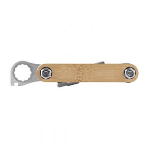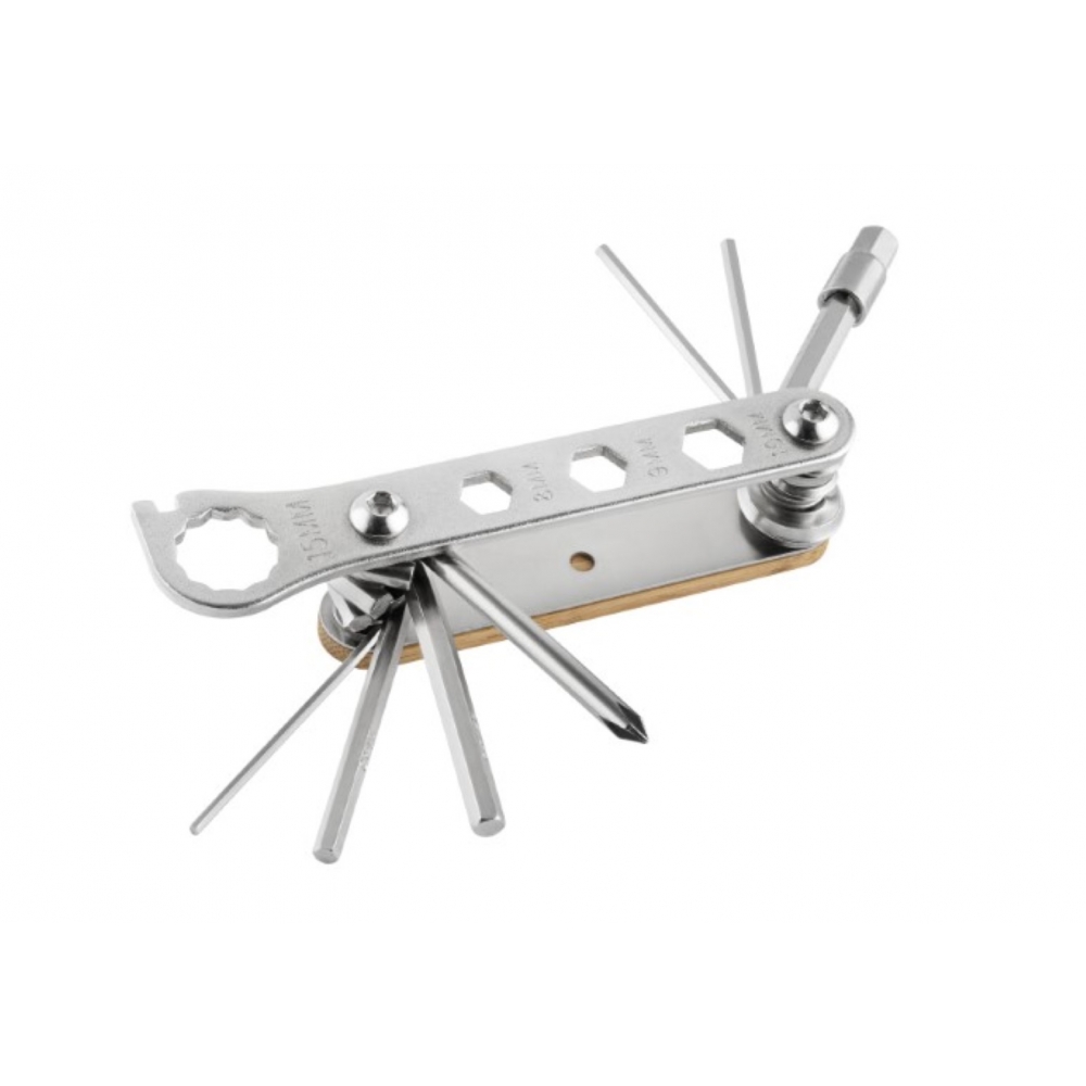 Artikel-Nr: SPZ7307-00.000Praktisches BikeTool mit natürlicher Bambusgriffschale für alle Job-, Sport- & Freizeitbiker in kompakter Pocket Ausführung, mit extrem praktischen 13 Funktionen für alle Fälle (7 x Sechskantschlüssel, 1 x Schraubendreher (Kreuz), 15mm, 10 mm,9mm, 8 mm Schraubenschlüssel), Speichenspanner, Qualitätsstahl, Craft Paper Box.