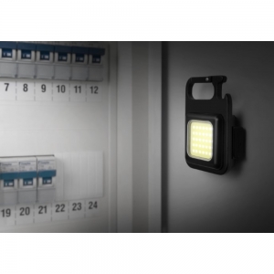 Artikel-Nr: SPZ600-00.001Innovatives, wiederaufladbares 500mAh, Aluminium "Schlüsselanhänger" Worklight mit super hellem 500 Lumen starkem COB Licht. 3 Leuchtmodi 100%, 70% und Strobolicht. Umweltschützend ohne Einwegbatterien, sondern mittels LithiumPolymer Akku wiederaufladbar - Multiuse: Homeworking, Panne, Sport, Haushalt, Alltag durch vielfältige Befestigungsmöglichkeiten per Karabiner am Schlüsselanhänger / Tasche, per Magnet, per integriertem Aufstellmechanismus oder per 6 mm Gewinde auf Stativ / Selfiestick. Ein Kapselheber, ist auch an Board. 2 Leuchtmodi + Blinken, COB 500 Lumen, Leuchtdauer 3h bei 100%, IPX4, Karabiner, Magnet, Ständer / Taschenclip, Gewindehalterung 6mm, USB-C Ladekabel. VPE 250. Craft Paper Box.