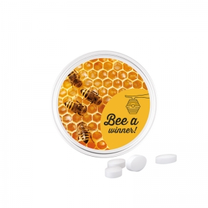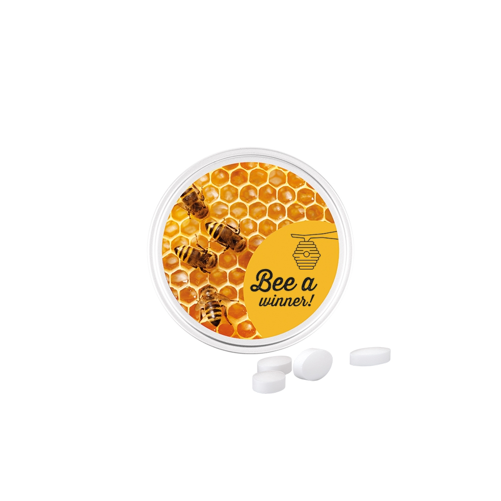 Artikel-Nr: PUC1017.00036Runde Dose mit Stülpdeckel, weiß, aus Metall, individuell bedruckt. Frische-Versiegelung rundum mit Etikett, Weißblech 98% recycelbar. Inhalt: Pfeffi Pfefferminzpastillen, zuckerfrei, 45 g