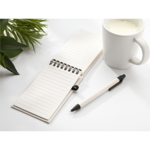 Artikel-Nr: CLP275198WoW! A6-Notizbuch mit Umschlag und Papier aus den Resten von recycelten Milchkartons (bis zu 70%) und 30% Recyclingpapier. Das ringgebundene Notizbuch umfasst ca. 70 Blatt/140 Seiten cremefarbenes, liniertes Recyclingpapier (80 g / m²). Ein dazu passender blauschreibender Kugelschreiber, hergestellt aus recycelten Milchkartons, ist im Lieferumfang enthalten. Aufgrund der Verwendung von recycelten Materialien können kleine Imperfektionen im Material sichtbar sein. Dies verleiht dem Produkt ein einzigartiges Aussehen.