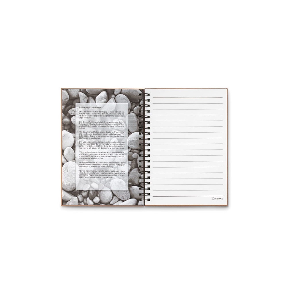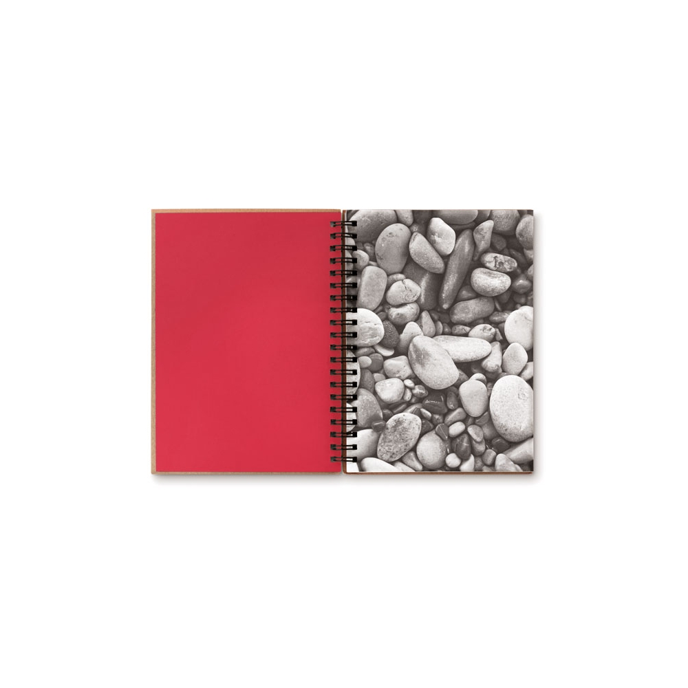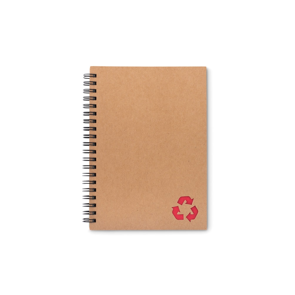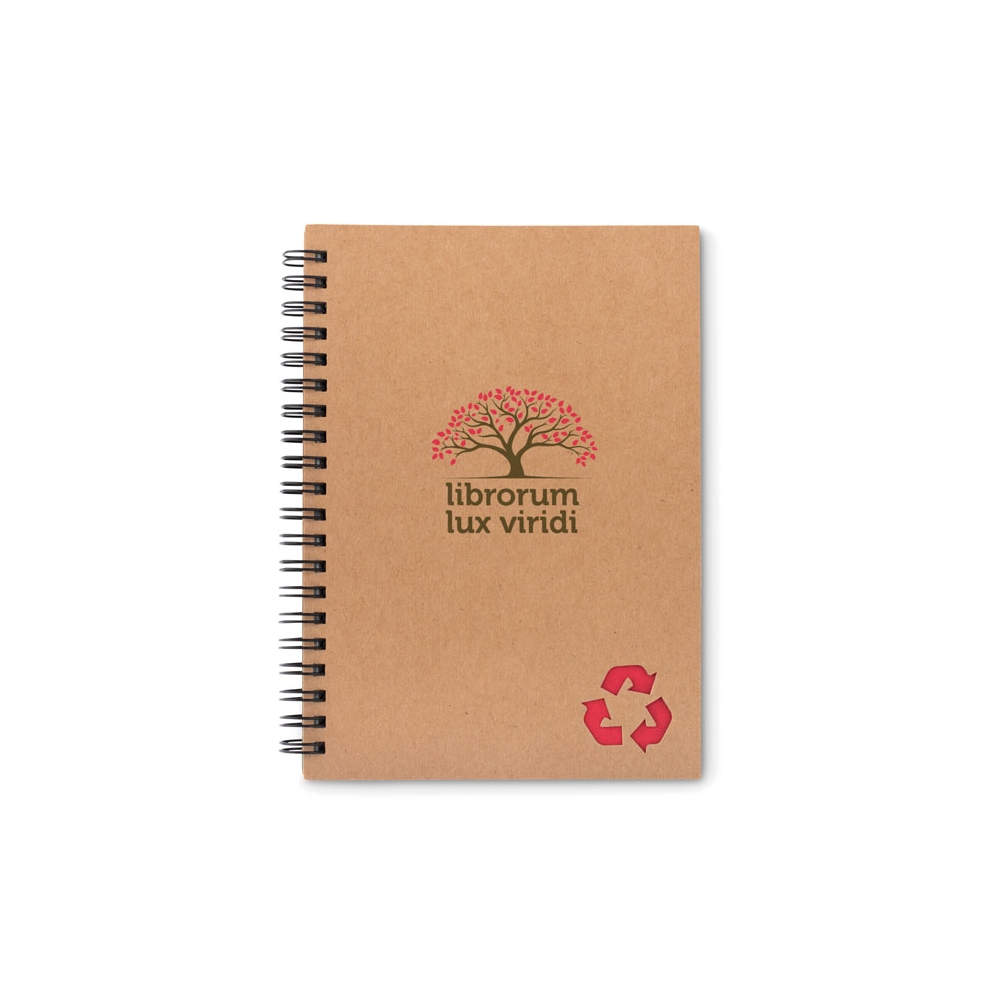 Artikel-Nr: OCBMO9536-05Notizbuch mit recyceltem Kartoneinband. Doppeldraht. 140 linierte Seiten aus Mineralpapier (70 Blatt). Mineralisches Papier wird aus Kalziumkarbonat und HDPE (Polyethylenharz) hergestellt. HDPE wird als Bindemittel verwendet. Es ist wasserdicht und Beständig gegen Fett.