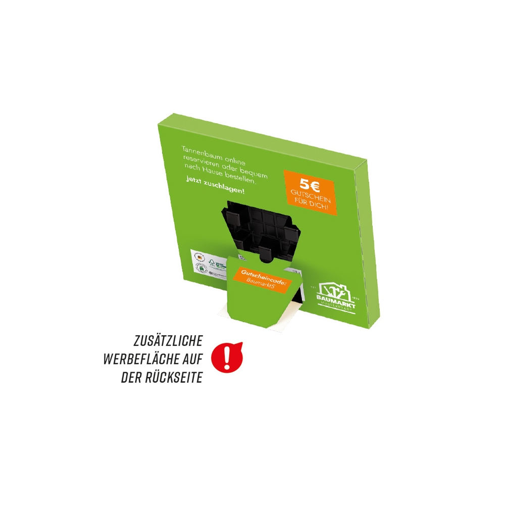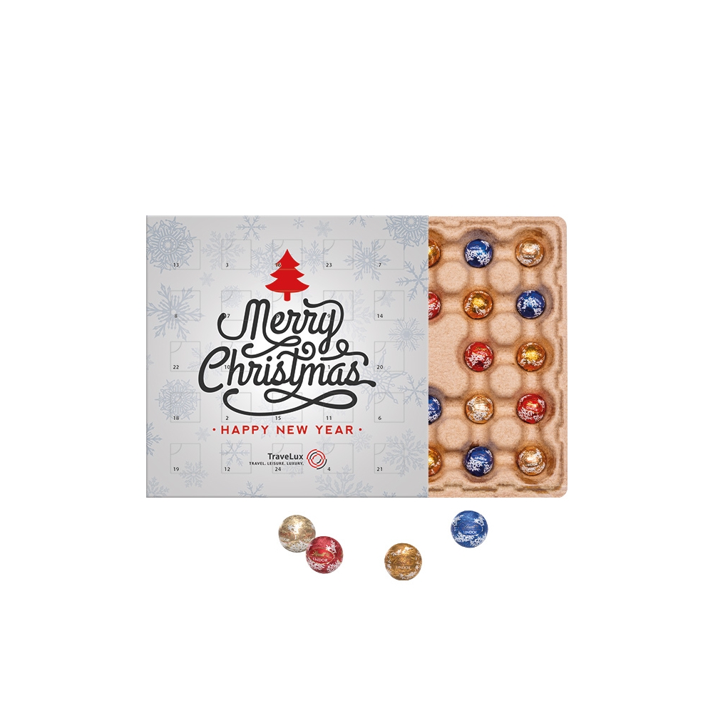 Artikel-Nr: PUC1087.00002Adventskalender in Vollkartonhülle mit Blister aus Papier - kann über die Papiertonne entsorgt werden, recycelbar, individuell bedruckt. Mit ausklappbarem Tischaufsteller und Aufhänger im Rücken integriert. Inhalt: 24 LINDOR Mini Kugeln von Lindt. Mischung: Milch, Dunkel, Caramell, Weiß, 109 g. Saisonartikel - solange der Vorrat reicht!