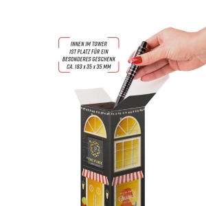 Artikel-Nr: PUC1085.00001Adventskalenderturm mit kompostierbarem Inlay, rundum individuell bedruckt. mit 5 Werbeflächen. Inhalt: 24 LINDOR Mini Kugeln von Lindt. Mischung: Milch, Dunkel, Caramell, Weiß, 109 g. Saisonartikel - solange der Vorrat reicht!