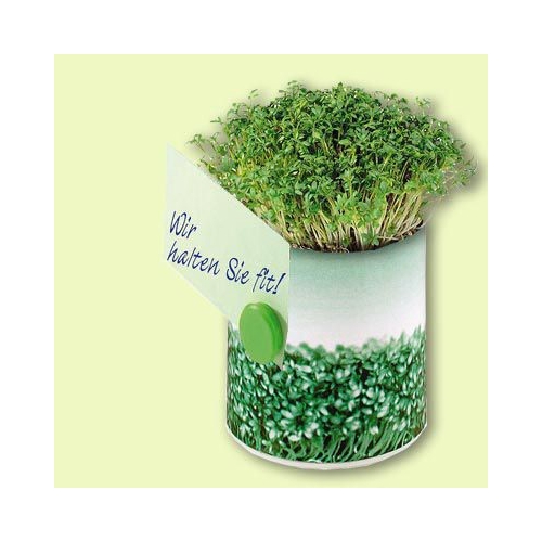 Inhalt: Spezialgranulat, Samen Samen : Kresse Format des Werbeartikels: Ø 55 x 65 mm Gewicht: 48 g Werbefläche: 179 x 20 mm Eindruck Werbefläche: Banderole als eigene Gestaltung