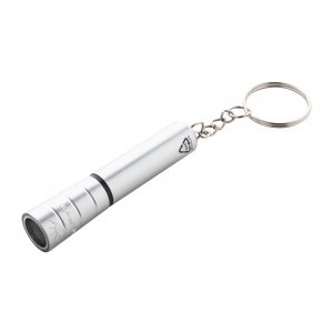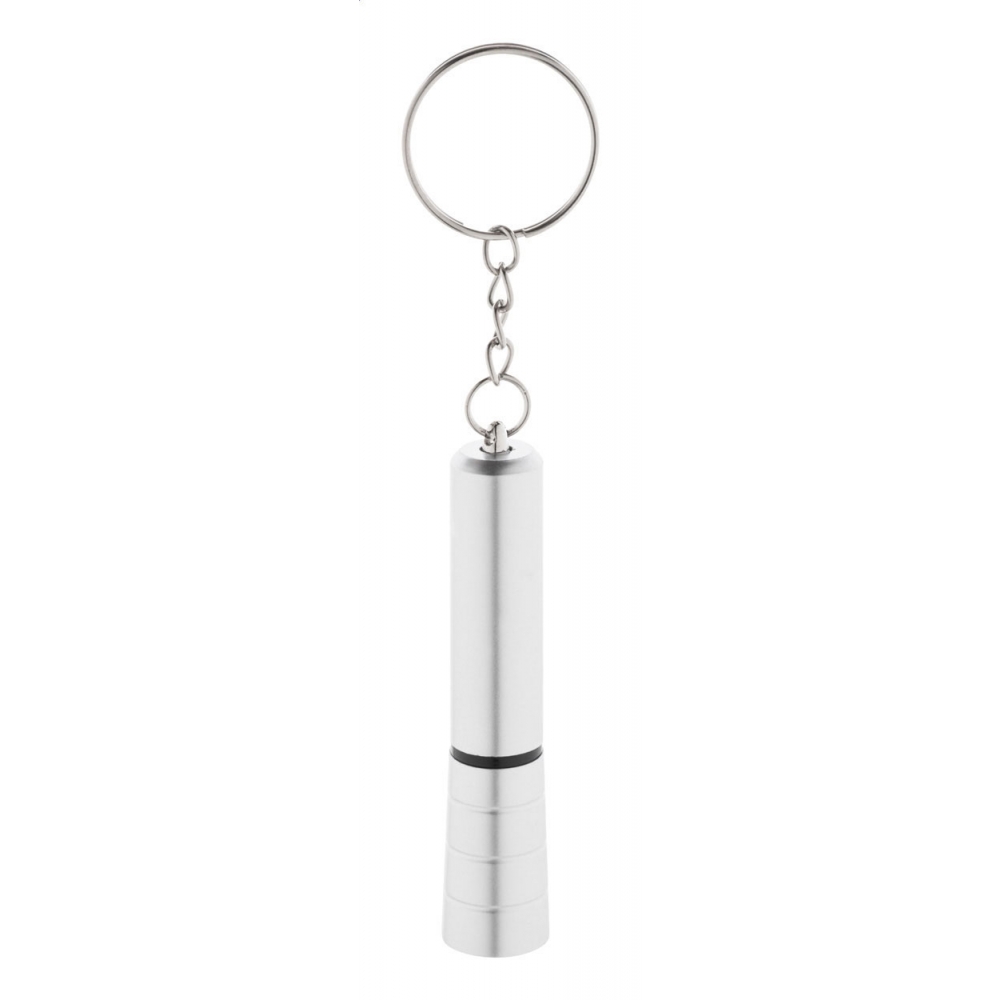 Artikel-Nr: AND864056-21Mini-Taschenlampe aus recyceltem ABS-Kunststoff mit 1 LED, eleganter Metallic-Oberfläche und Metallschlüsselring. Inkl. Knopfzellenbatterie.