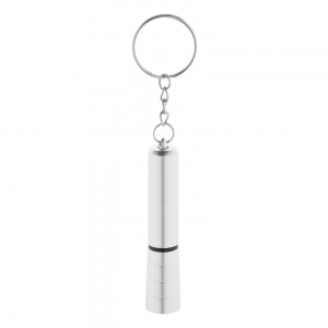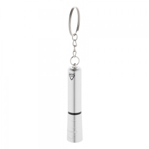 Artikel-Nr: AND864056-21Mini-Taschenlampe aus recyceltem ABS-Kunststoff mit 1 LED, eleganter Metallic-Oberfläche und Metallschlüsselring. Inkl. Knopfzellenbatterie.