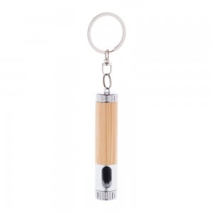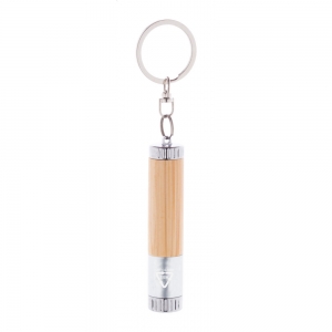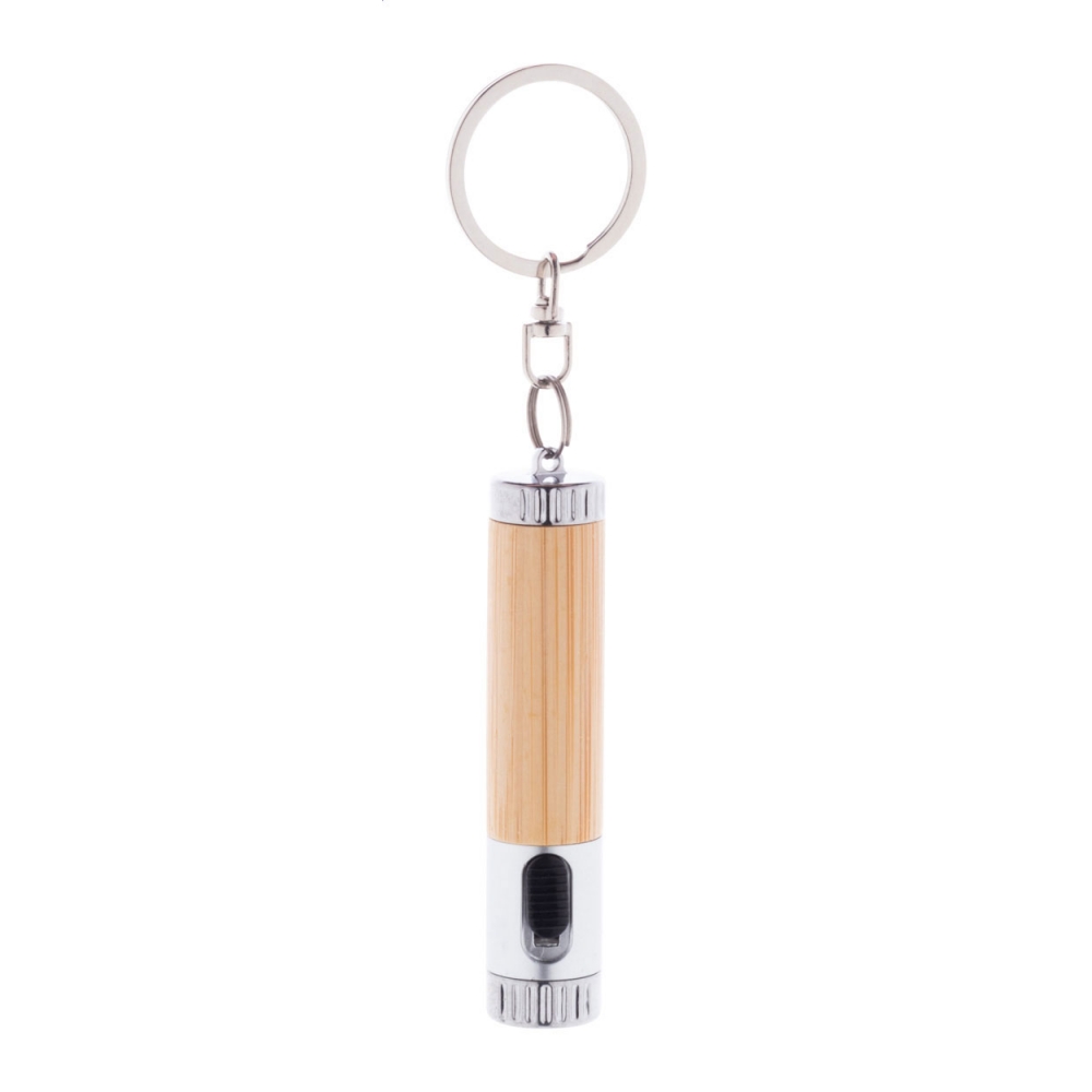 Artikel-Nr: AND808146-21Mini-Taschenlampe aus Bambus und recyceltem ABS Kunststoff mit 1 LED und Metallschlüsselring. Inkl. Knopfzellenbatterie.