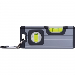Artikel-Nr: EAG529177Mini-Wasserwaage aus Aluminium mit Kunststoffapplikationen aus ABS, zwei Libellen, Magnet auf der Unterseite und einem Karabiner. Ihre Werbung bringen wir mittels einer Lasergravur auf der Wasserwaage an.