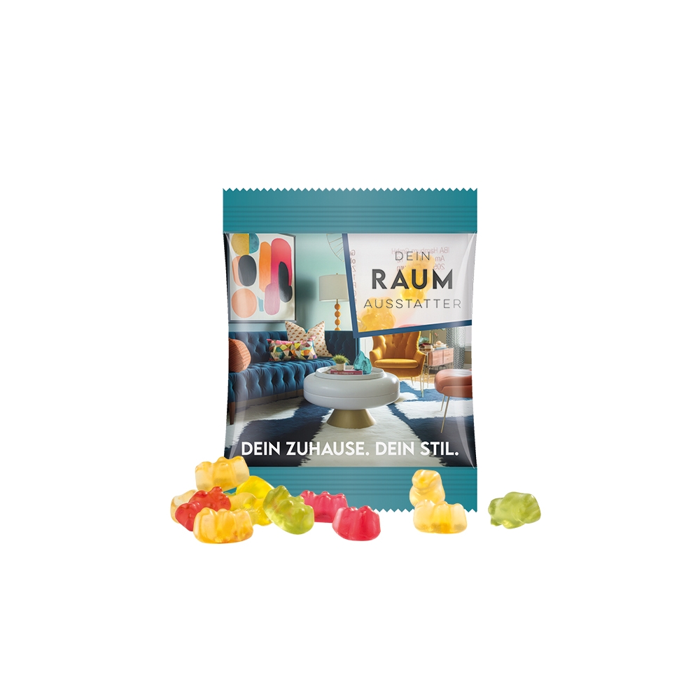 Artikel-Nr: PUC1021.00389Trolli Fruchtgummi in Tüte aus transparenter Folie, individuell bedruckt. Inhalt: Trolli Fruchtgummi Bärchen, in Premium Qualität mit 10 % Fruchtsaftanteil, bunt gemischt, 10 g