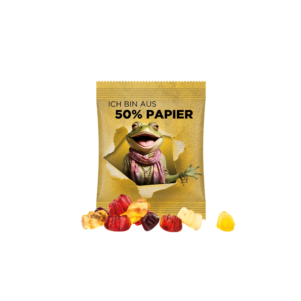 Ausführung: Material: Folie mit ca. 50% Papieranteil, Füllung: Trolli Gummibärchen, 30 % Fruchtsaftanteil