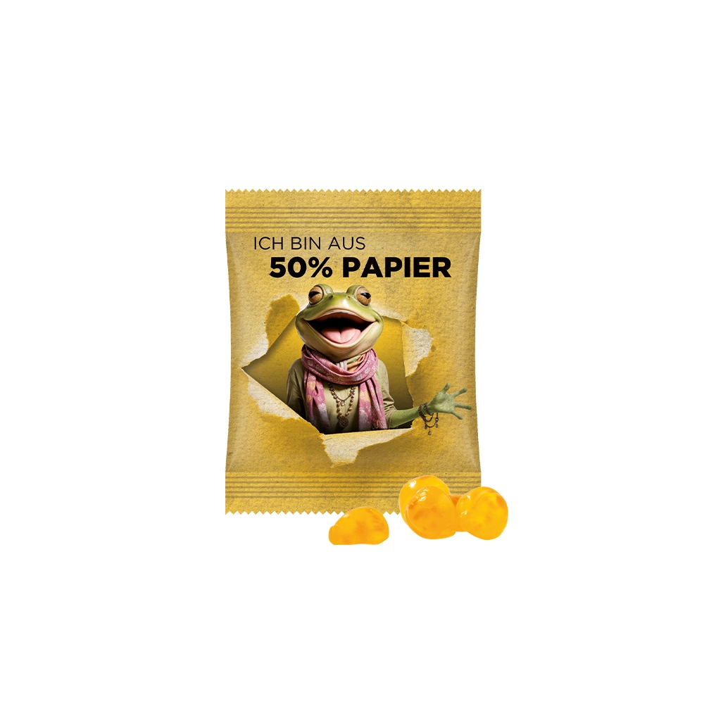 Artikel-Nr: PUC1022.00142Trolli Fruchtgummi in Tüte aus weißer Folie mit ca. 50% Papieranteil, individuell bedruckt. Inhalt: Trolli Vitamin-Fruchtgummi, mit Fruchtsaft, fruchtigen Stückchen und 10 Vitaminen, in der Geschmacksrichtung Pfirsich, 15 g