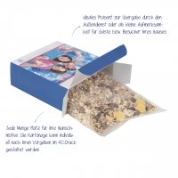 Artikel-Nr: 49430335Solche Give-aways erfreuen den Empfänger ebenso wie den Überbringer. Unsere bedruckbare Aktionsbox aus stabiler Kartonage enthält ca. 250 g einer unserer leckeren Müslisorten, aromasicher in Folie verpackt. Gerade für Außendienstaktionen, Kundenbesuche oder Events mit direktem Kundenkontakt bietet sich dieses repräsentative und einfach zu handhabende Präsent an.
