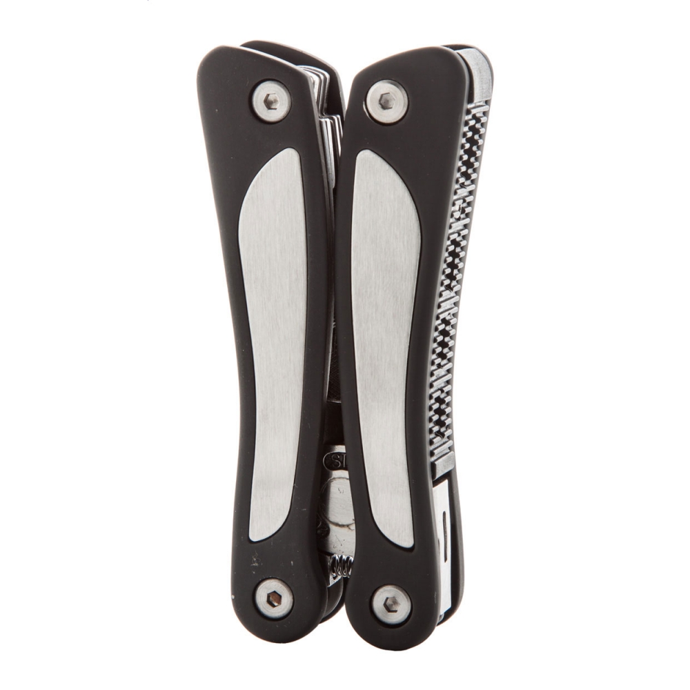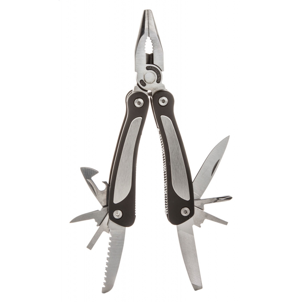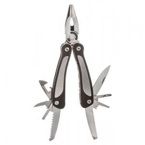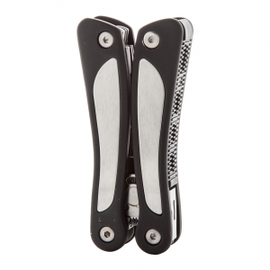 Artikel-Nr: AND808021Multi-Tool aus Edelstahl mit neun Funktionen: Zange, Nagelfeile, drei Schraubendreher, Messer in zwei Größen, Dosenöffner und Säge. Einzeln in schwarzem Polyester-Etui.