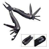 Multi-Werkzeug mit 11 Funktionen. An diesem handlichen Tool ist einfach alles dran, was Mann und Frau beim Handwerken benötigen. Alle Teile sind aus schwarzem rostfreiem Edelstahl 420 gefertigt. Die eloxierten Aluminiumgriffe bestechen durch ihre edle Optik. Folgende Werkzeuge bietet Ihnen dieses Tool: Zange mit Seitenschneider, Messer (Klingenlänge 6 cm), Säge, Phillips-Schraubendreher, 2x Schlitz-Schraubendreher (3 / 4 mm), Dosenöffner, Kronkorken-Heber, Metallfeile und Ahle. Die Klingen-Arretierung bietet ein Höchstmaß an Sicherheit und Komfort und verhindert ein unbeabsichtigtes Einklappen der Werkzeugteile. Nylon-Gürteltasche inkl.