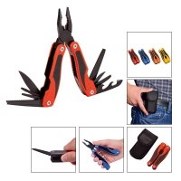 Artikel-Nr: 57382140RO-SWMulti-Werkzeug mit 11 Funktionen. Mit diesem Multi-Tool haben Sie stets das richtige Werkzeug zur Hand. Für kleinere Reparaturarbeiten im Haushalt oder auch als Begleiter auf Reisen, beim Camping, auf Ausflügen und anderen Outdoor-Aktivitäten ist es bestens geeignet. Hinter den ABS-Griffschalen mit Aluminiumeinsätzen sind zahlreiche praktische Werkzeuge aus schwarzem rostfreiem Edelstahl 2Cr13 untergebracht: Säge, Schlitz-Schraubendreher (3 und 5 mm), Phillips-Schraubendreher, Messer (Klingenlänge 6,0 cm), Dosenöffner, Kronkorken-Heber, Ahle, Metallfeile, Zange mit Seitenschneider. In der Handhabung erweist sich das Multi-Tool als sehr sicher, da alle Werkzeuge im geöffneten Zustand über den Verriegelungsschutz arretiert werden. Nylon-Gürteltasche inkl.