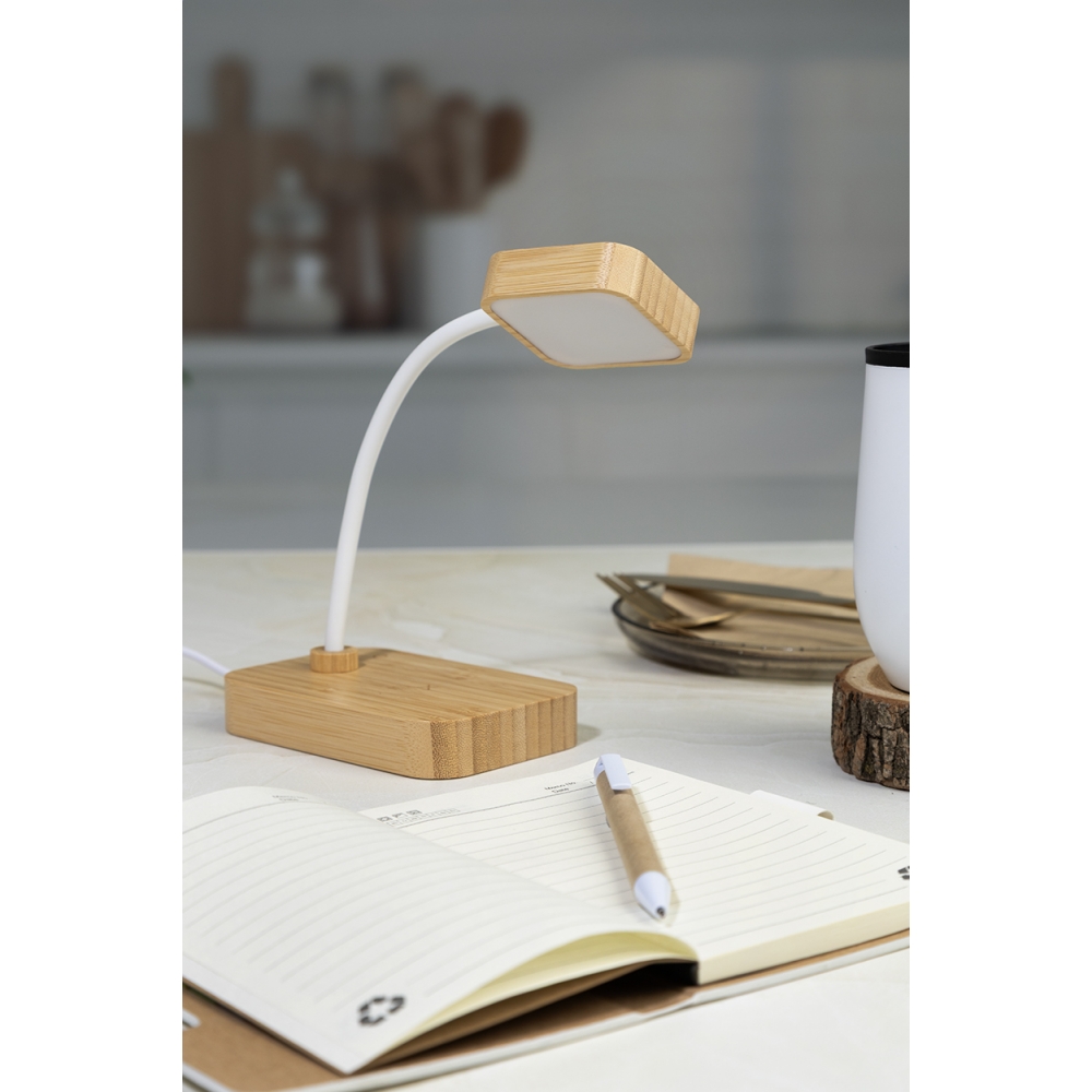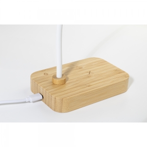 Artikel-Nr: AND864145Multifunktionale Schreibtischlampe aus Bambus mit 12 LEDs und integriertem Wireless Fast Charger (15 W). Mit warmem, neutralem und kaltem Lichtmodus sowie einstellbarer Helligkeit. Inklusive USB-Ladekabel.