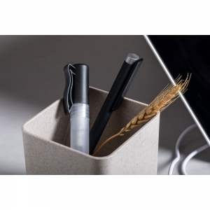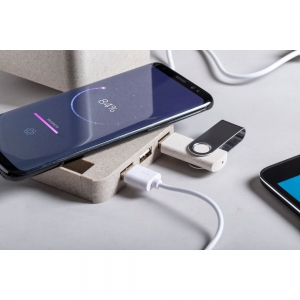 Artikel-Nr: AND721851-00Multifunktionaler Stifteköcher aus ökologischem Weizenstroh-Kunststoff mit Handyhalter, Wireless-Charger (5 W) und 3-Port-USB-Hub (USB 2.0). Inkl. USB-Kabel.
