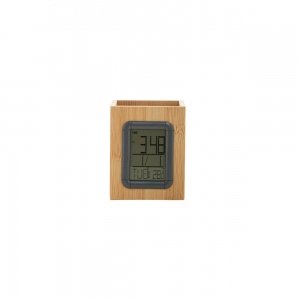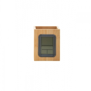 Artikel-Nr: AND864013Stifteköcher aus Bambus mit multifunktionaler Digitaluhr. Funktionen: Wecker, Kalender und Thermometer. Mit Knopfzellenbatterie.