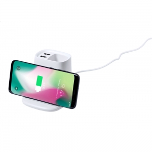 Artikel-Nr: AND810469-01Multifunktionaler Tisch-Stifteköcher aus Kunststoff mit Handyhalter, eingebautem Wireless-Fast-Charger (10W) und zwei USB-Ladeports (max. Ausgang 2000 mA). Inkl. USB-Ladekabel.