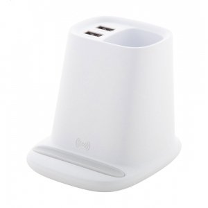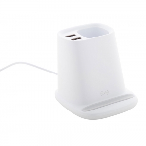 Artikel-Nr: AND810469-01Multifunktionaler Tisch-Stifteköcher aus Kunststoff mit Handyhalter, eingebautem Wireless-Fast-Charger (10W) und zwei USB-Ladeports (max. Ausgang 2000 mA). Inkl. USB-Ladekabel.