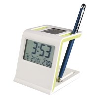 Artikel-Nr: 326210761000Desktop-Gadget mit Display für Uhrzeit, Tag, Datum und Temperatur. Mit zwei Schreibgerätehaltern und einem Visitenkartenhalter. Vier Modi: Kalender, schlafende Alarmfunktion, Geburtstagsalarm und Countdown-Modus.