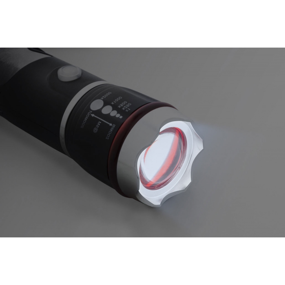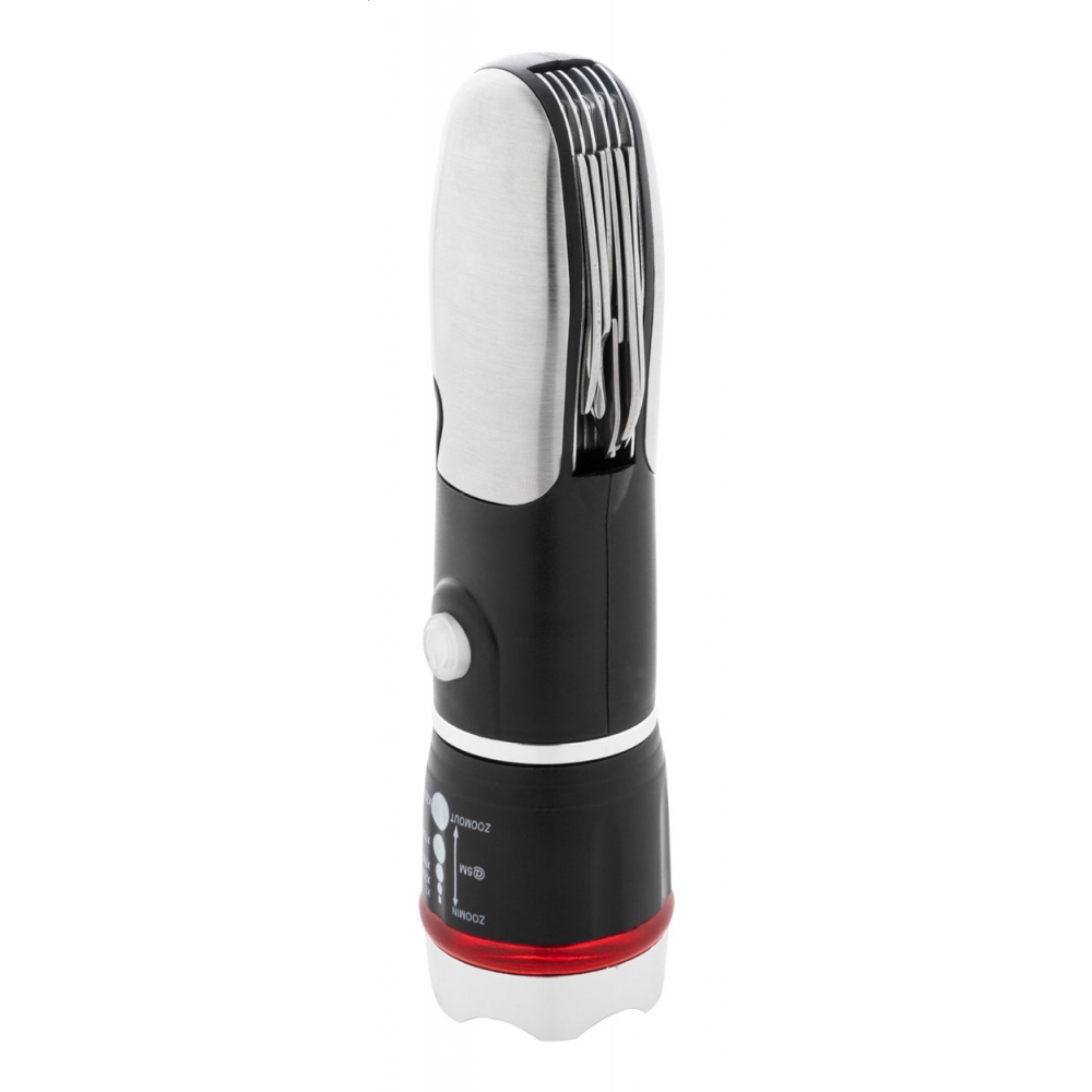 Artikel-Nr: AND864066Multifunktions-Taschenlampe aus ABS und Edelstahl mit Nothammer, Gurtschneider und Multitool mit 9 Funktionen. Mit zoombarem LED-Licht und 3 Lichtmodi. Exkl. Batterien (3x AAA).