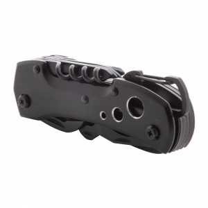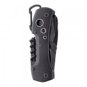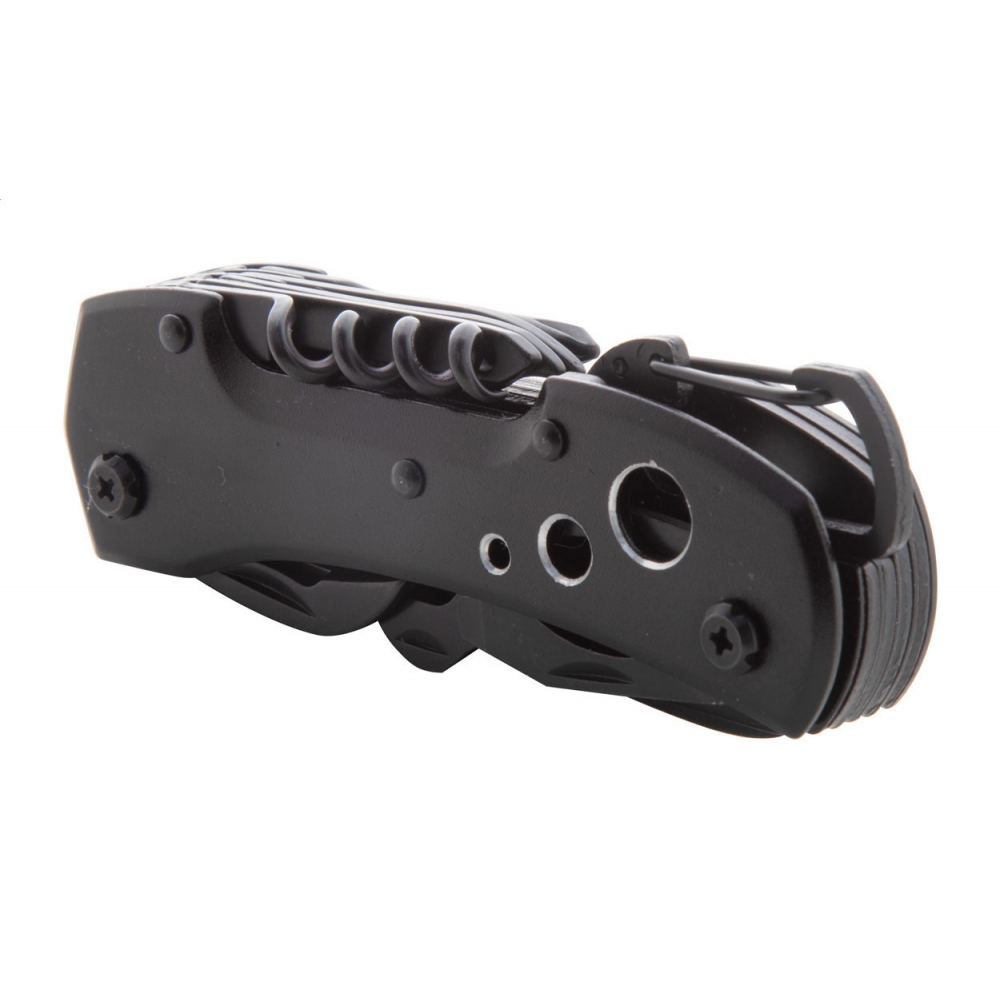 Artikel-Nr: AND808106-10Komplett schwarzes Edelstahl-Taschenmesser mit 13 Funktionen, Aluminium-Griffen und Karabiner.