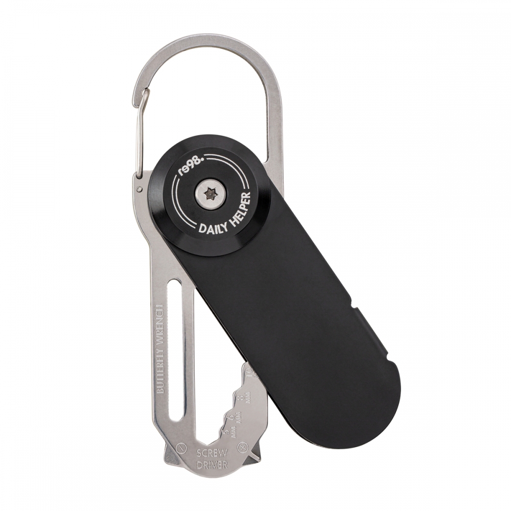 Artikel-Nr: RFS52689-BKEin Werkzeugkasten ist schwer, und meistens benötigt man im Alltag nur einen Bruchteil der Werkzeuge. Eine Alternative bietet dieses kleine Multifunktionswerkzeug – das hochwertige RE98 Daily Helper Tool vereint mehrere praktische Funktionen. Durch Drehen am Clip-Karabiner fahren Sie das Werkzeug aus. Dank der hochwertigen, innenliegenden Kugelführung bleibt das ausgeklappte Werkzeug in einem stabilen Zustand bei 180°. Das Tool beinhaltet einen Kreuz- und einen Schlitzschraubendreher, einen Schraubenschlüssel für die Größen 5, 6, 8, 10, 12 und 14 sowie einen Flügelmutter-Schraubendreher. Nach Gebrauch können Sie das Tool durch Drehen wieder sicher im mattschwarzen Werkzeugschutz verstauen. In diesem Zustand ist der leicht bedienbare Clip-Karabiner zur Befestigung an Taschen, Gürtelschlaufen oder am Schlüsselbund einsatzbereit. Das handliche Tool ist aus extrem robustem SS420-Edelstahl gefertigt. Eine hochwertige, schwarze Aluminiumscheibe sorgt für zusätzliche Stabilität und trägt zur erstklassigen Verarbeitung und Haptik bei. Der mattschwarze Werkzeugschutz bietet eine große und präsente Werbefläche. Das Multifunktionswerkzeug kann mit einem farbigen Tampondruck oder einer feinen Lasergravur veredelt werden. Das RE98 Daily Helper Tool wird in einer hochwertigen 1C-Geschenkverpackung geliefert.