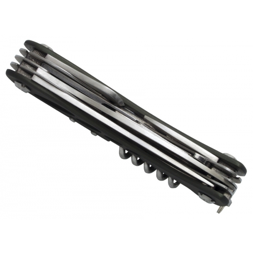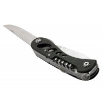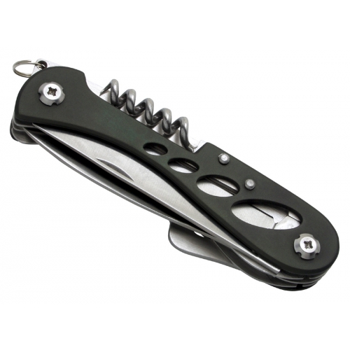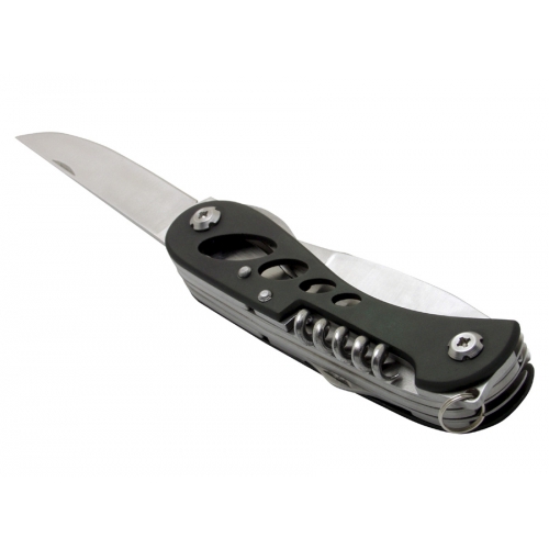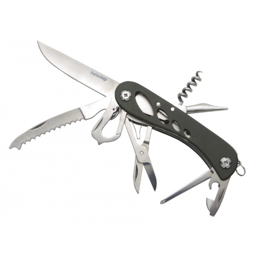 Artikel-Nr: 688ECO094Multifunktionsmesser aus rostfreiem Stahl, gummierter Aluminiumgriff. 12 Funktionen: Messer mit Sicherheitssperre, Säge, Flaschenöffner, Schere, kreuzförmiger Schraubenzieher, Scheibenzertrümmerer, Karabiner und Dosenöffner mit Blockierungssystem, Schraubenzieher, Korkenzieher, Einfädelhilfe, Befestigungsring. Lieferung in Kartonbox.