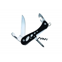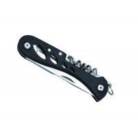 Artikel-Nr: 688ECO161Multifunktionsmesser aus 2CR13 Edelstahl mit Griff aus Aluminium und gummierter Oberfläche. 7 Funktionen: Messer, Flaschenöffner, Dosenöffner, Schraubendreher (4 mm / 2 mm), Korkenzieher, Ring. Klingenlänge: 7 cm